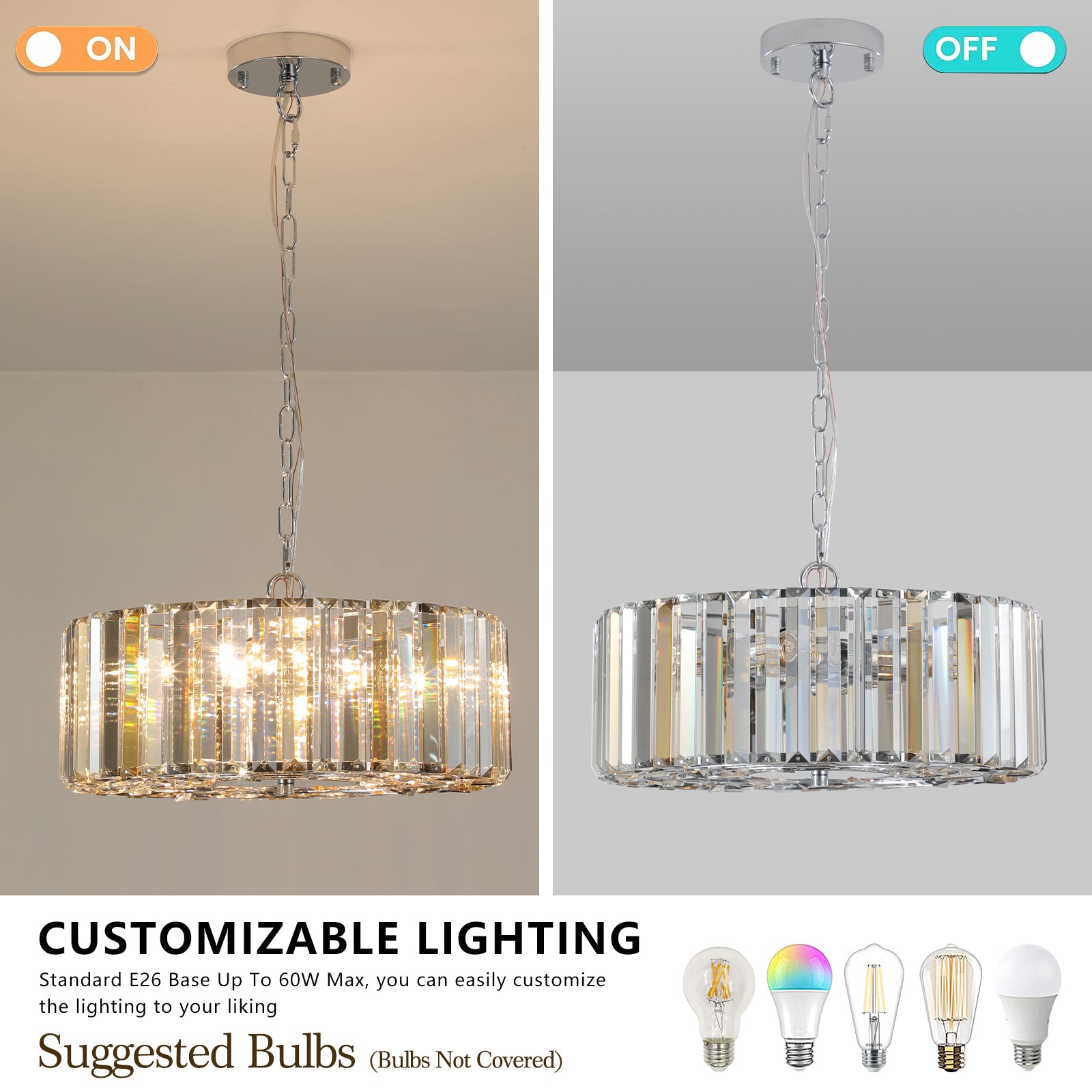 - Light refracts toward the ceiling, creating a soft and elegant ambiance