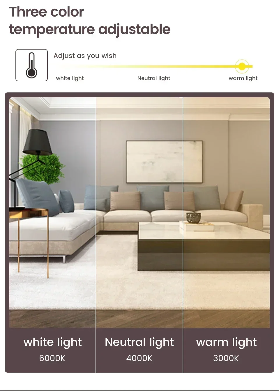 1:"switch Rontrol" option, support 85V-265V voltage, you can switch different light colors through the switch control, white light, neutral light, warm light